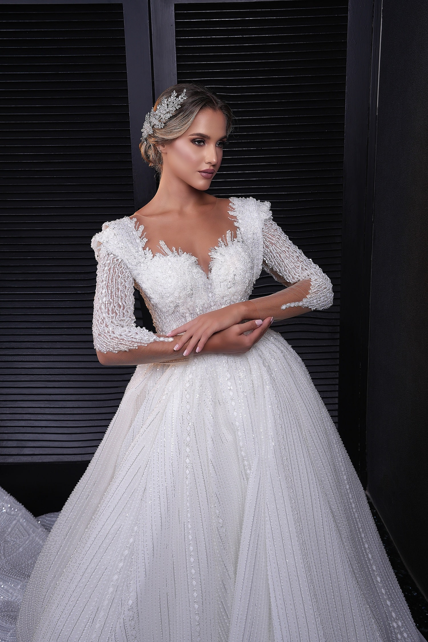An A-line wedding dress gets romantic updates to create a beautifully unique, poetic wedding dress. With visible boning details that add silhouette-defining structure to the sheer sweetheart bodice and removable swag sleeves for an off-the-shoulder look, the gown is finished with embroidered floral appliques that cascade down the airy, tulle skirt. Glittery layers add sparkling dimension, and the look is finished with a hidden skirt slit.
