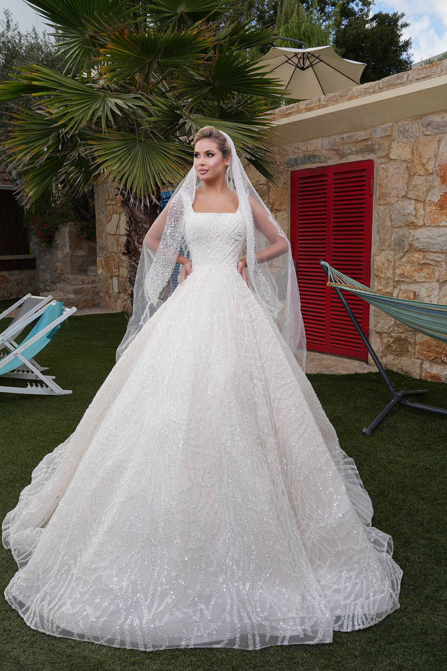 Metallic-tipped lace floats above a layer of shimmering organza, creating a ball gown wedding dress that twinkles in the light. A combination of etched and dense floral appliques adds interest to the sheer corset bodice and full, lightweight skirt. Nude illusion fabric keeps the off-the-shoulder long sleeves comfortably in place throughout your big day.
